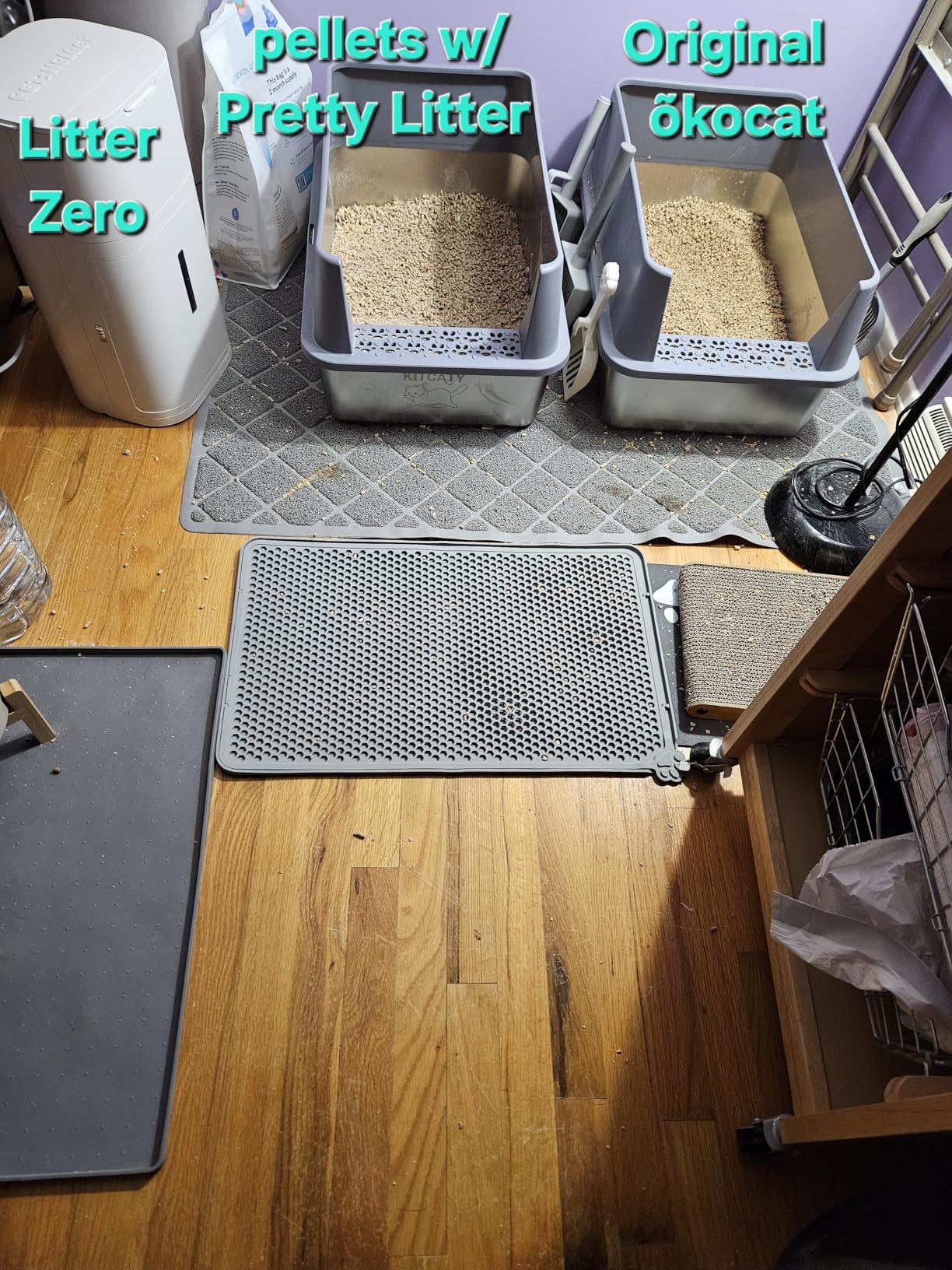 First, I've done animal rescue for years and am a retired vet tech, so when I say, I have researched and tried every litter out there, I mean EVERY one. We currently have 6 cats, 3 are foster/rescues so 5 litter boxes.I had been using Pretty Litter for the last 8 years, but something has changed and it is now so dusty, I had to wear a mask to clean the litter boxes and still my allergies were severe, so back to researching I went.Clay based litter is a no go and I haven't had luck with newspaper and corn cob can cause "pillow foot" so wood based seemed like the next try. I wanted to stay with one ingredient, no harsh perfumes or additives.I did try all except the super soft oxocat because of the weight difference vs price (5.5 pounds less for $1 less than the others)Pros:*Healthy for you and your cats*You get used to the wood fragrance (Like being in the lumber yard)*Not 99% dust free but probably 90% less dust than any others, no more masks to clean the boxes*One ingredient, many textures to choose from*Good clumping (don't sift too much, the right scoop is key here, I'll get into that, cons)*No urine odor*Doesn't stick to the bottom of the litter box (all our boxes are aluminum)*Not no tracking but also not like sand on the floor and very easy to see and sweep up*No added colors*Good price for the amountCons:*Tried the Less Mess first (pellets) did add some old type of litter to train to new texture, not all of the cats liked it and started having BMs outside of the boxes. (Getting the original flake type did solve this problem)*While it is very good at absorbing the ammonia odor from urine, if your cat doesn't cover it's BMs, it's like a lumber yard of cat poo, but after the cats got used to the texture, they are all now covering their BMs. YaY!*You must find the right size litter scoop (slot size) to use the pellets, otherwise you are shaking so much it breaks all the clumps of urine up. I bought several scoops, I usually only buy the aluminum ones but couldn't find any with large enough slot openings so, I did list in the pictures the scoop I did have the best luck with. It is a bit of a light weight plastic, so if your cats urinates in the corners and you need to dig a little, use a sturdier one to do that and then scoop with the small Depets scoop. I really wish the litter companies that make pellets would also sell a scoop that actually works with their product.Overall, I give oxocat 5 stars as it has been a great litter, I will continue to use the original or multi-cat since I have at least one pellet hating cat. It is easier to sift which makes scooping all the boxes much faster.I will also note that I have had no issues with any broken bags from shipping, I did see that in a couple reviews and a lot on the C**wy website. I think on there it's because they are shipping it with other objects, items in the box which is breaking or tearing the bags. But no issues of that from Amazon, it always comes in it's own box. No litter is 99% dust or tracking free but this one is the closest I've found.I hope this helps some folks with their quest to finding the perfect litter.