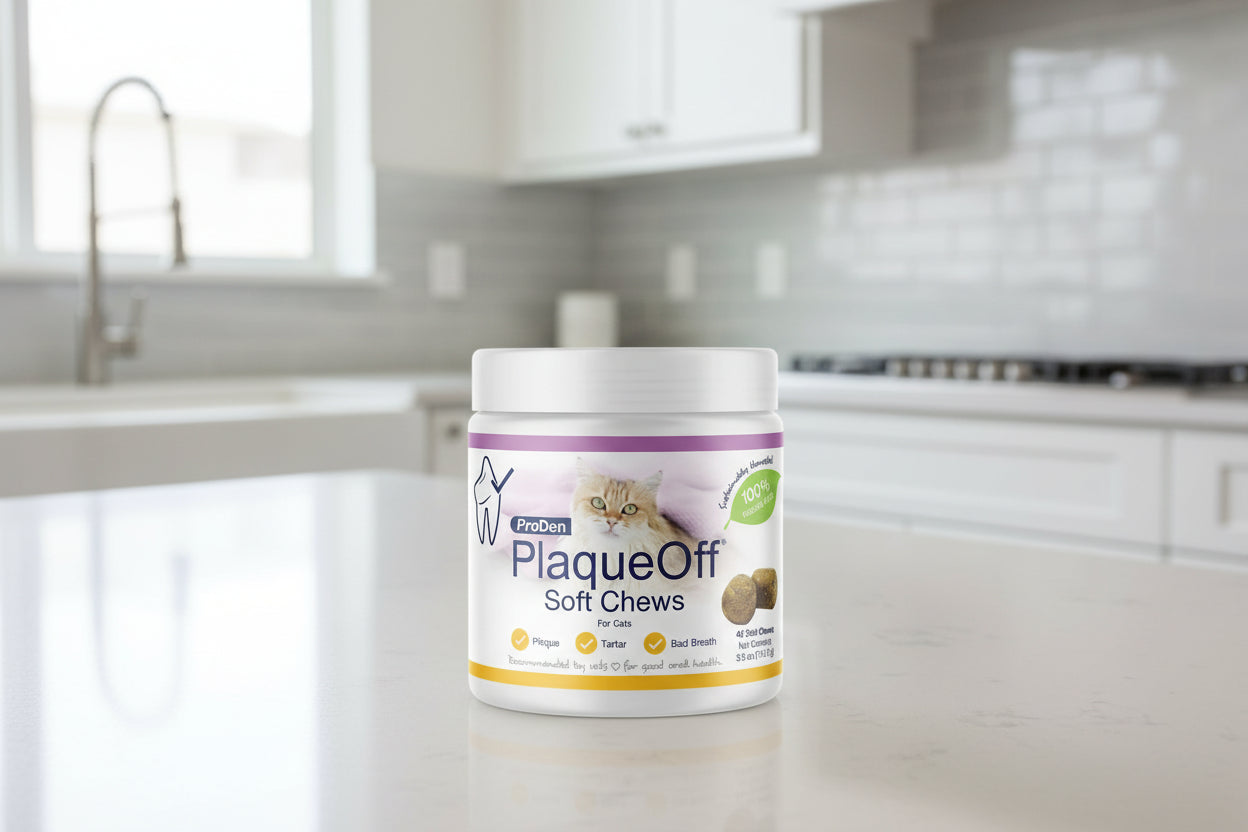 ProDen PlaqueOff Cat Soft Chews. For use in cats. Recommended to support healthy teeth, gums and breath odor. The ProDen PlaqueOff key ingredient is 100% natural kelp and is sustainably harvested in the clear, cold waters off the Scandinavian coastline. Clinical trials on our kelp have shown to help reduce plaque and tartar while helping to improve bad breath. Veterinarian formulated & Recommended.
