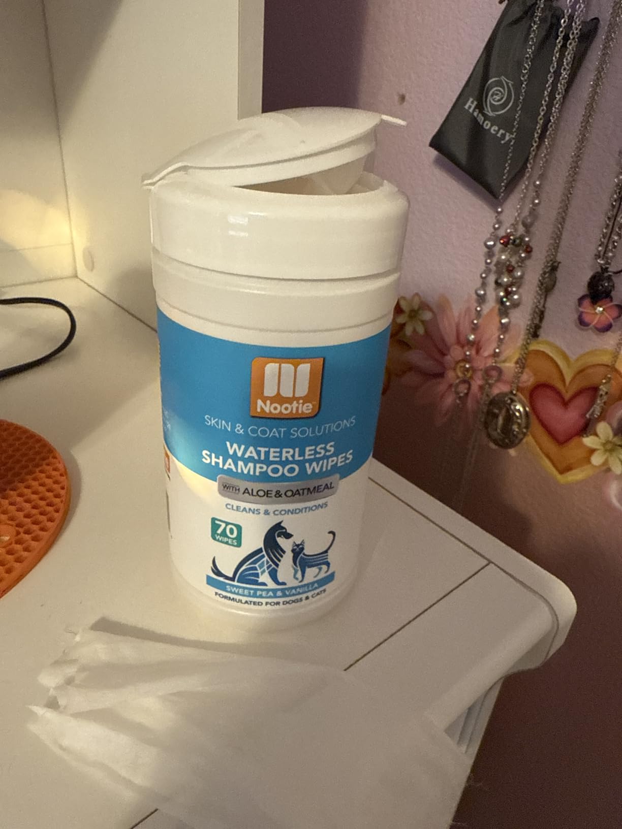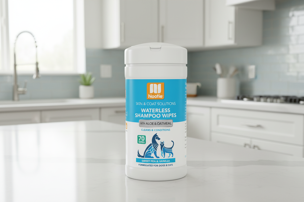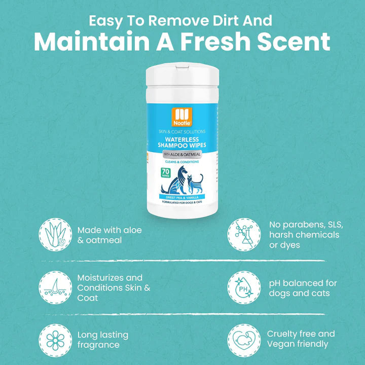 Keeping your pet clean and smelling fresh between baths is easy with Nootie Waterless Shampoo Wipes. This no-rinse, alcohol-free, deodorizing formula contains active cleansing ingredients plus fur-softening glycerin and soothing aloe & oatmeal to clean and condition your pet’s skin and coat.